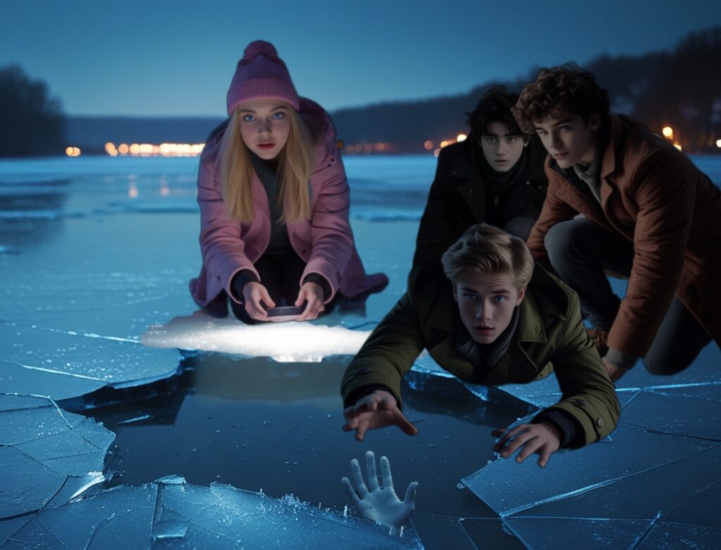 Lyla was the first to scream, but Mia was the first of us to move. We all made it to the edge of the pond, suddenly aware that the ice was too thin to play on. I knew it held Johnny until Kari threw the stone, though, so I went out and lay down flat. I slid to the hole in the ice and stuck my hand down in the water, swishing it. “Johnny!”